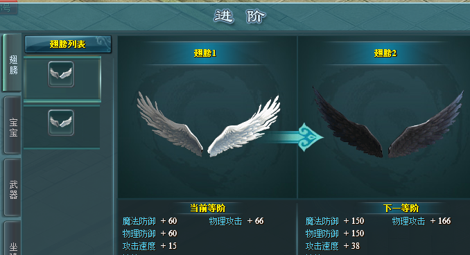 进阶系统分为了翅膀,坐骑,宝宝,特殊武器进阶。